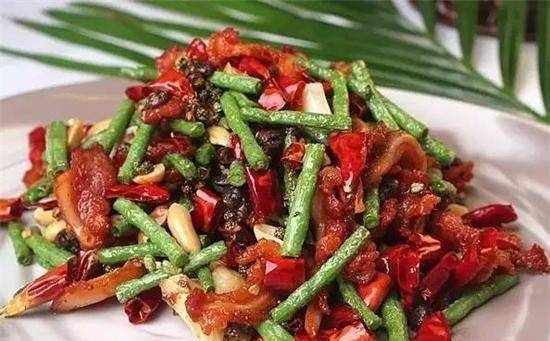3、锅留底油,放干辣椒节、花椒炒香,再倒入猪脆骨和豇豆节,加盐、白糖、味精调味,淋少许香油,炒匀即可。
