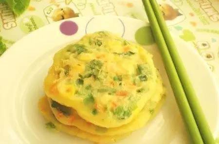 材料:玉米粒50克,胡萝卜30克,生菜30克,鸡蛋3个,面粉100克,葱、芝麻油、胡椒粉各少许