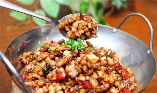 2.锅中放入猪油至7成油温,加入小米辣、蒜蓉煸香。加老干妈,加脆肠翻炒出香味。再淋入山胡椒油入味。