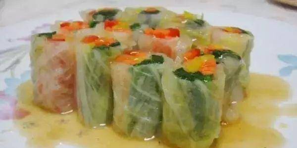 3.将蔬菜丝码在白菜叶上,卷成卷,切成段。