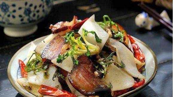 食材:五花腊肉、饵块、莲藕、姜片、花椒、盐