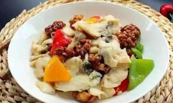 4.底油,爆香葱姜蒜,下入彩椒,翻炒几下,加1勺料酒,适量盐,鸡精,三四勺开水,2勺生抽。2勺水淀粉勾个薄芡,下入鱼片,均匀裹上汤汁,最后下入核桃仁,翻炒出锅西