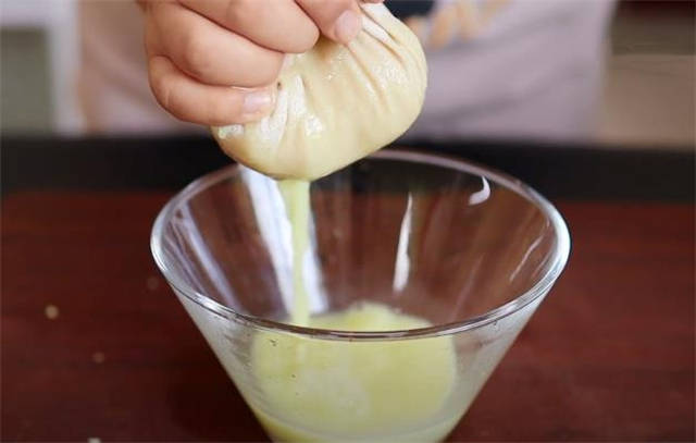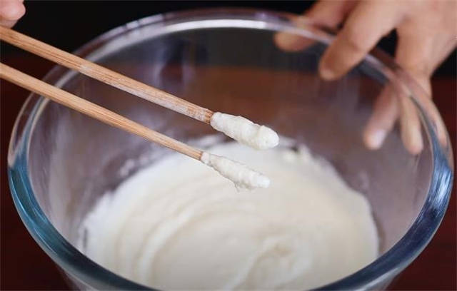 3.一共过滤了150g的姜水,然后再少量多次的放上150g糯米粉,一直搅拌到像这样没有干粉的状态就可以了。