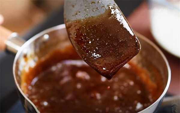 4.现在我们熬个红糖浆,150g的红糖,放一点清水进去,刚开始搅拌的时候糖水还很稀,等慢慢的水分蒸发掉了,它就会变得越来越粘稠。