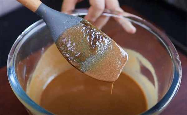 5.趁热把糖浆倒在糯米粉里面,最后搅拌好的状态就是这种颜色一致的粉糊。