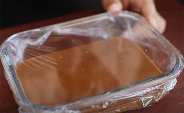 6.模具里面刷点油防粘,把粉糊倒进去,表面封一张保鲜膜,防止水蒸气滴落影响成型,然后戳几个小孔让它透气。