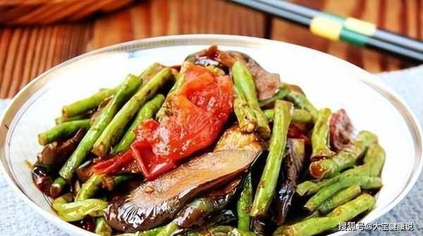 食材:茄子200克,西红柿1个,豌豆150克,辅料:油、生抽、盐、老抽、蒜末、鸡精。