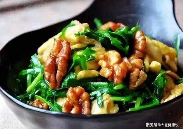 原料:韭菜100克、核桃50克、鸡蛋2个、橄榄油、盐、白糖1克、香油
