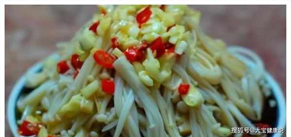 5.将糖、白醋、香油、蒸鱼酱油拌匀,浇在金针菇上。
