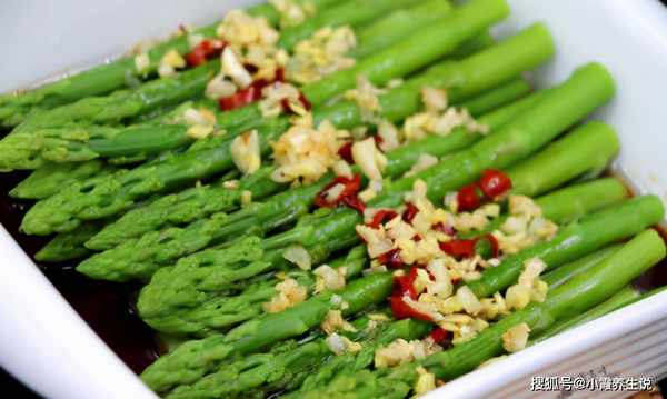 3、将切碎的大蒜和泡椒放在芦笋表面,淋上酱油;