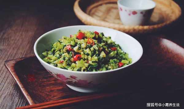 6.将炒好的芥菜放入碗中,盖上两片芥菜叶。