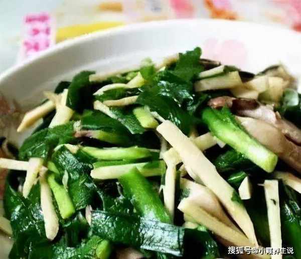 5、待茎开始折断时,放入菊花叶炒香,加盐、蔬菜水果粉,叶半熟时关火上桌。