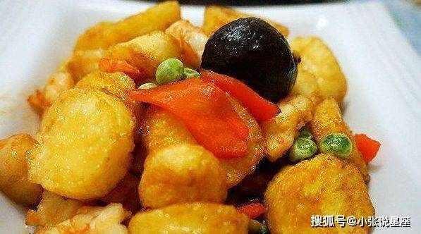 7.加入备用的鲜虾和鹰嘴豆,然后倒入炸好的日本豆腐。由于它很脆,所以最好搅拌而不是油炸。最后如果汤多的话,加一点水和淀粉,汤稍微粘一点就更好了。