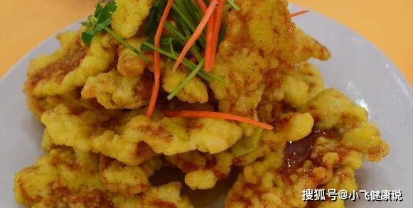 5、在腌制好的肉片上均匀抹上一层面团,摊开,一个一个放入锅中,炸到变硬捞出。待外皮金黄酥脆,内软时取出。