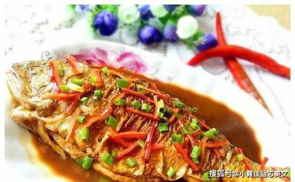 3.黄鱼加入普丁和葱段,加入糖和生抽,倒入半杯水,大火烧开,转中小火,文火收干向上