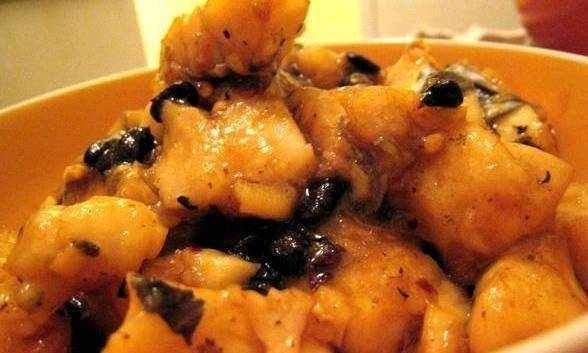 5、倒入鱼块,小心搅拌,使香料和鱼块混合均匀;