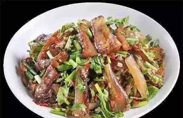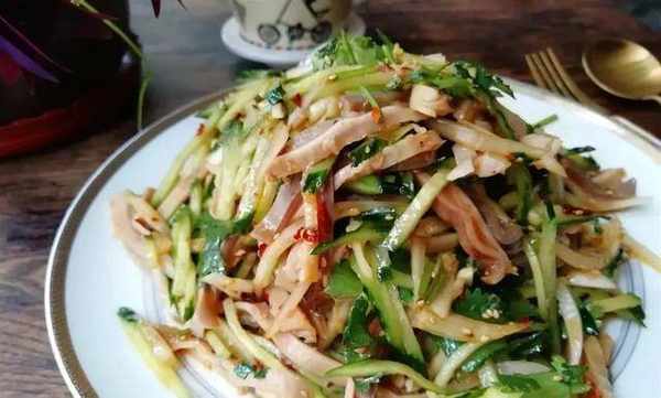 2、烹调时先将炖好的牛筋切成小条,加入香菜结、葱结、小米胡椒粉、盐和花椒油拌匀装盘。