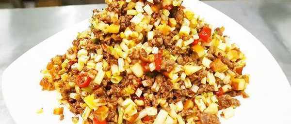 6、然后开中小火将牛肉的水分炒香。这个过程大概需要1分钟,家庭小灶要2分多钟。牛肉的水分炸好后,加入切碎的材料炒香(姜、蒜、泡椒)。待材料炒香后,加入5克豆角,转小火将豆豉炒香。花生酱炸好后,我们就开始做菜了。