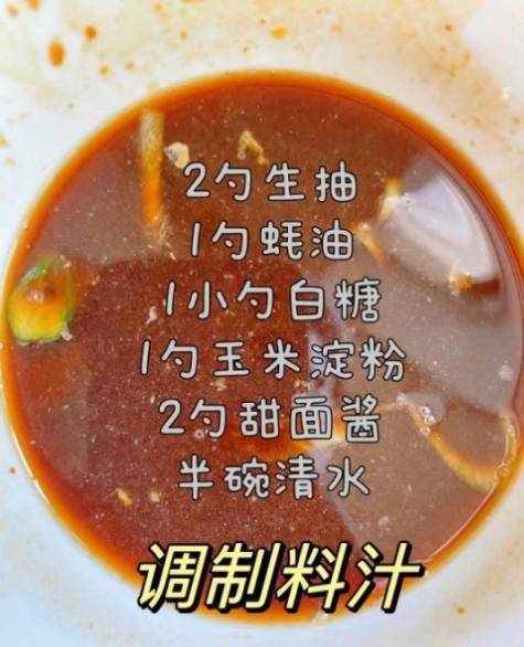 第三步:准备好一个空碗,调配一碗酱料汁,分别调入生抽2勺,一勺蚝油,一小勺白糖,一勺玉米淀粉,两勺甜面酱,半碗清水,迅速搅动一会儿。