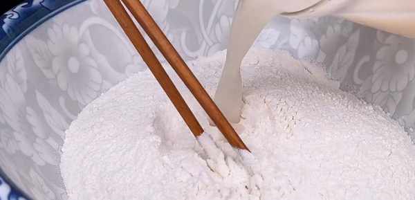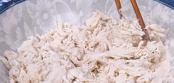 1.盆中倒入300克面粉,加入3克酵母,5克白糖促进酵母发酵,搅拌均匀,然后用160毫升温水和面,一边倒一边搅拌,少量多次地加。