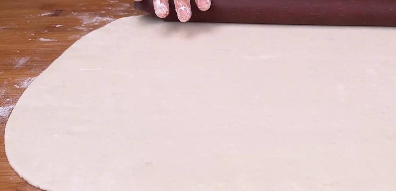 7.稍稍按扁,再用擀面杖把它擀成长方形面片,厚度在0.3-0.5厘米为宜。