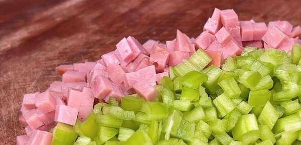 4.发酵时间准备配菜,切点青椒丁跟火腿肠丁。火腿肠可以用自己喜欢的任何口味。