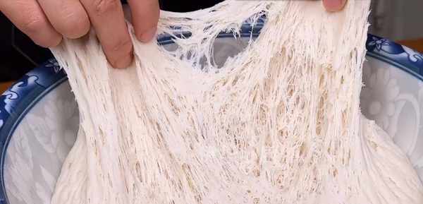 5.发酵好的面团体积变大,拉开内部充满了气孔。发酵时间不固定,天热热发酵就快一点。