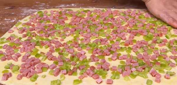 8.在表面先刷上一层油,然后撒点干面粉跟盐,这个做法是跟涂抹上油酥差不多,为了分层的效果。再把火腿丁跟青椒丁铺在上面就可以了。