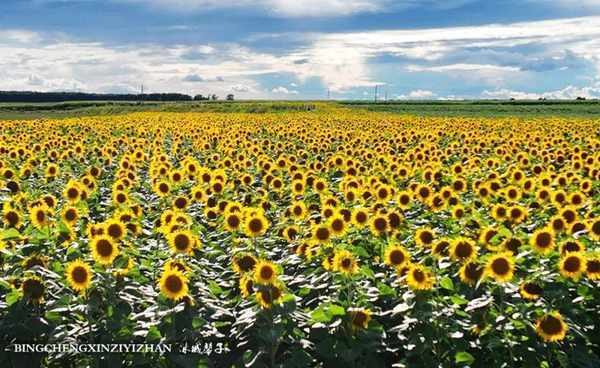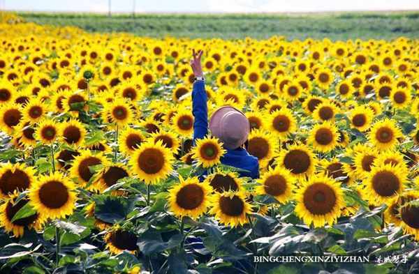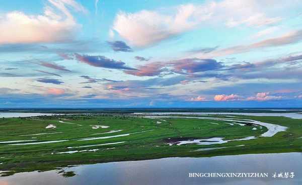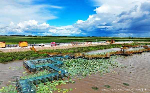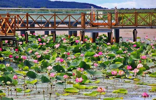 八月正是荷花盛开的季节,蓝蓝的天,白白的云,粉艳的荷花,一片边疆的恬静风光。