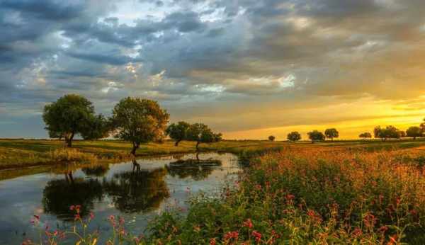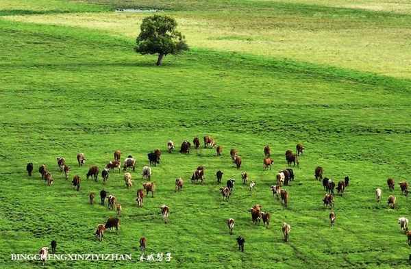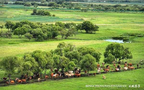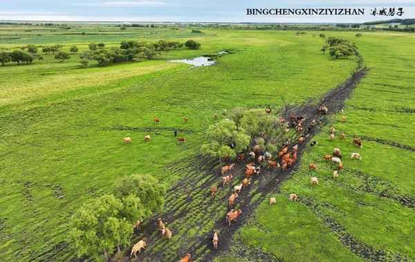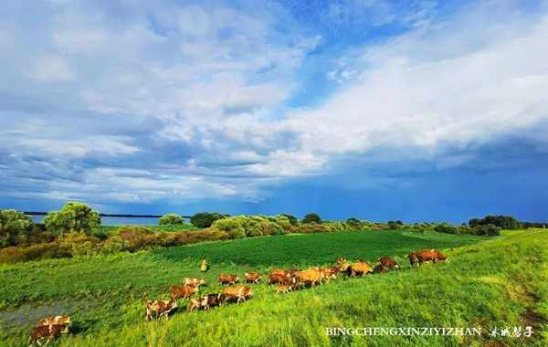 辽阔的草原上河流、树木、沙滩、牛群错落分布,这里没有一点的人工痕迹,完全是一幅生态自然的画卷。