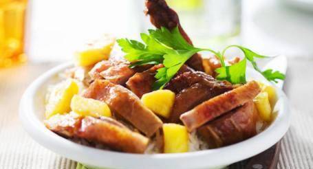 做法:1.鸭子洗净切块;将菠萝切成小块;将洋葱切成小块,准备姜片。