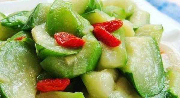 3、放入丝瓜,加水100ml,炒至丝瓜软熟,加入枸杞,加盐和鸡精炒透。