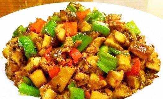 2、烤熟备用,原锅留余油,加入切好的香菇炒软。将茄子泥放入锅中,翻炒至均匀沾上油,加少许盐、糖和生抽调味;