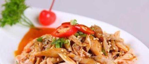 做法:1、鸡胸肉洗净放在清水中,加入花椒,姜片,料酒煮熟,用手撕成细丝,码入盘中、