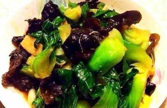 3、放入事前用水焯好的小油菜,翻炒2分钟,加已熟的黑木耳;
