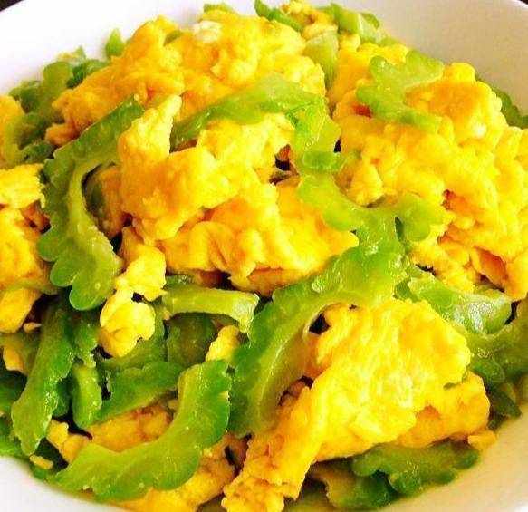 5.锅留底油,先下入切好的小葱头爆香,再倒入苦瓜块,大火翻炒1分钟,加入盐和鸡精调味,搅拌均匀,然后加入煎好的鸡蛋,搅拌均匀即可上桌。