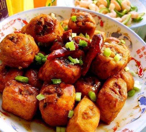配料:膨化豆腐、梅肉(或三肥七肥猪肉)、香菇、大葱、油、盐、玉米、果汁、黑酱油;