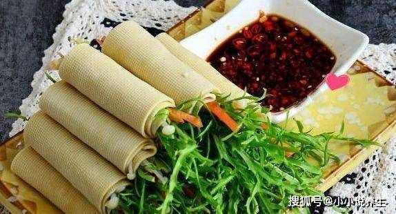 材料:豆腐皮2张、苦菊1片、金针菇50克、胡萝卜1根、生抽15毫升、白糖3克、醋10毫升、辣油少许、芝麻少许油