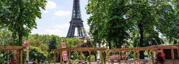 从5月9日起,在铁塔和夏乐宫中间的公园里,一个巨大的临时露天餐馆被搭建起来,令人惊喜的是,在这里我们可以坐着近距离欣赏铁塔。