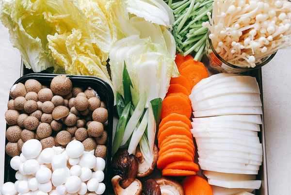 猪里脊 250g、金针菇 1包、蟹味菇海鲜味 1盒、香菇4个、娃娃菜340g、茼蒿1把、葱1根、北豆腐1盒、白萝卜1/3根、胡萝卜1/2根。