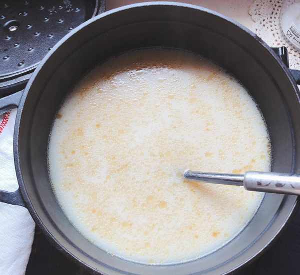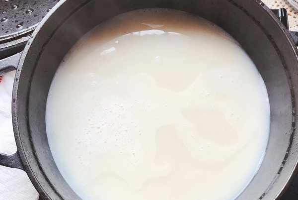 02.煮沸后,加入2杯(480ml)热豆浆。