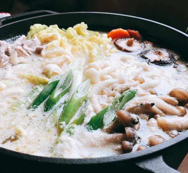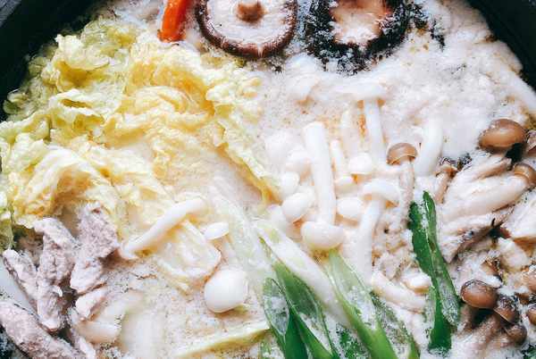 美味的日式豆乳火锅食谱,配上蔬菜、蘑菇和薄薄的猪肉片,在奶油般浓醇的豆浆肉汤中烹煮。