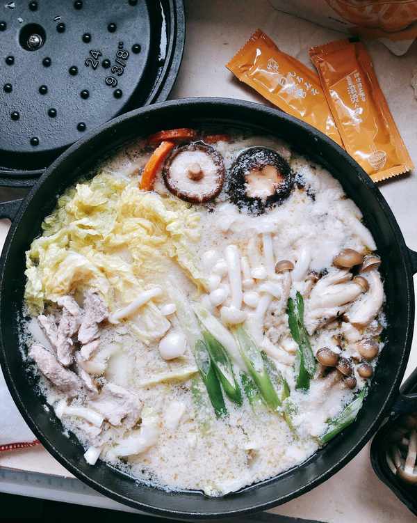 当所有的蔬菜和菌类都浸在肉汤里,所有的味道汇聚,融合出一道圆润可口的火锅汤底。