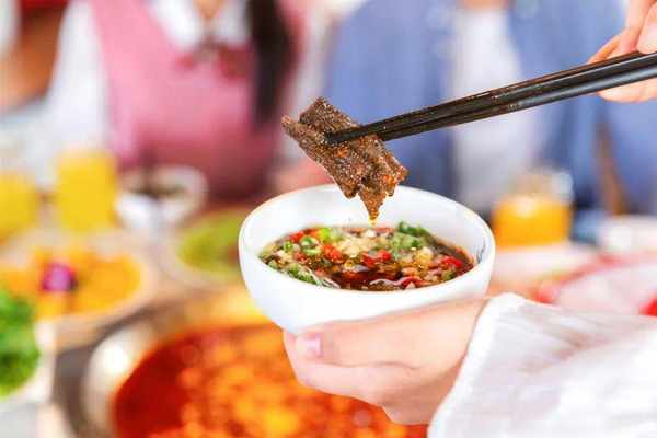 麻酱4000克、顶好花生酱1000克、蚝油500克、鱼露300克、雀巢美极鲜味汁150克、生抽400克、料酒500克、盐50克、味精200克,用凉开水搅开,盛入蘸碟,上面浇上韭菜花和粉碎好的腐乳,撒上炸好的干贝茸即成。