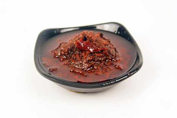 泡辣椒5000克,将泡辣椒蒂和籽去干净,用粉碎机粉碎至细腻,锅内下花生油5000克烧热,下入泡椒调小火炒至油色红亮,下海天牌海鲜酱500克、李锦记xo酱300克、熟芝麻碎、熟花生碎各500克、盐25克、白糖25克,太太乐鸡精500克炒香即可,可单独上也可以和蒜茸香油碟搭配上桌。