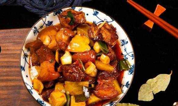 继续倒入生抽、老抽、料酒,搅拌均匀上色,然后撒上一些冰糖,搅拌均匀溶解,倒入足量的水,烧热。熬。