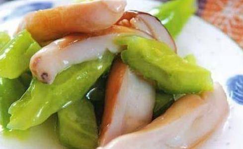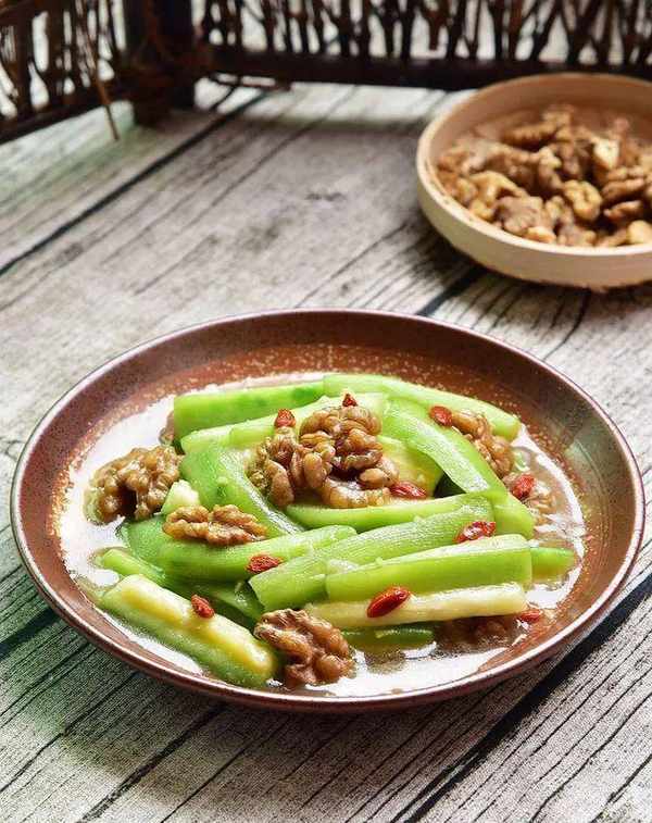 4、加入切碎的南瓜快速翻炒一分钟左右,加盐、少量糖和鸡精调味后起锅。草海绵与丝瓜络混合