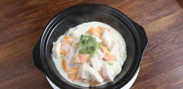 蒸好后取出碗,取一个大平盘,盖住碗口,翻过来取出碗。椰子南瓜和芋头砂锅