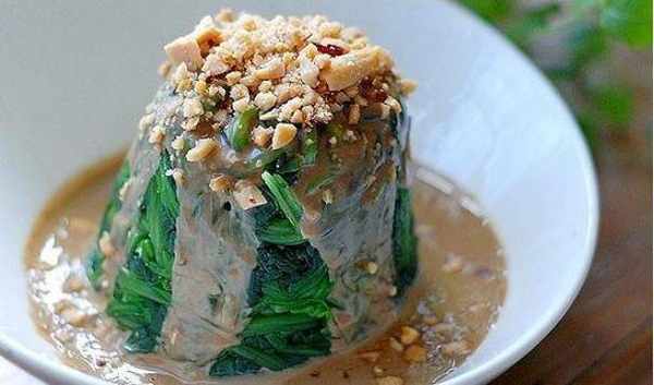 4.将拌好的芝麻酱淋在菠菜上,最后撒上花生碎。