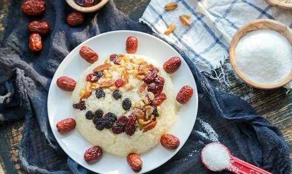 糯米放入电饭煲蒸熟;白果去皮,用沸水煮1分钟;水煮花生;将百合、小红枣、葡萄干洗净泡发。